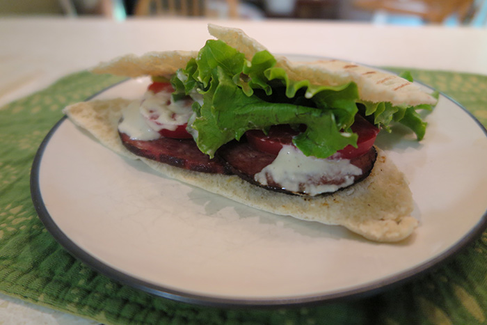 Heat a heavy cast iron pan and place gyro meat on it. Turn as needed to ensure even browning and avoiding to burn the edges. Remove when the meat is seared to your liking. You also can brown the Gyro meat by broiling in an oven.