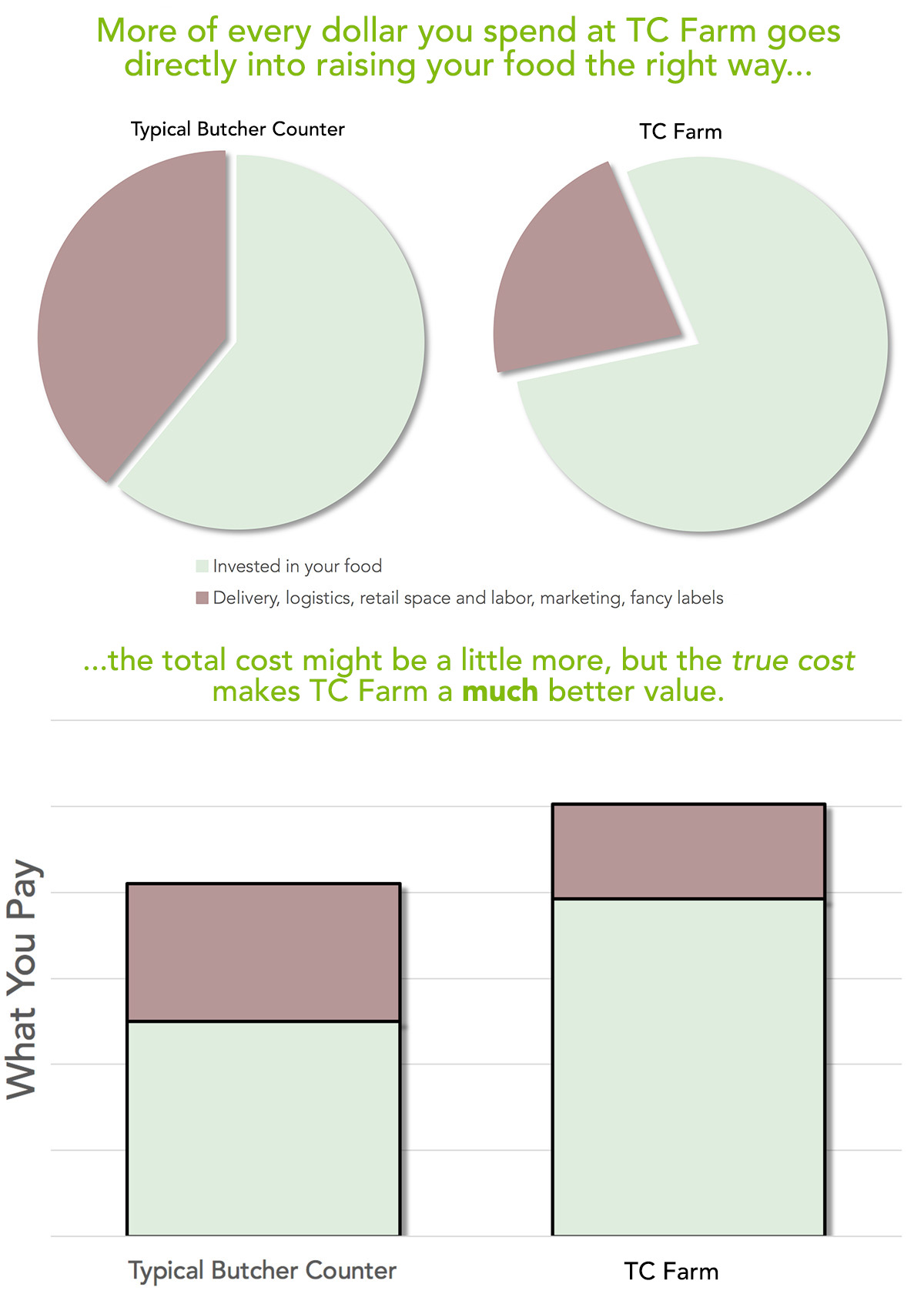 We view TC Farm as a cooperative of others who also care about their food. We figured out what it would cost to raise and deliver the food we loved so we could share it with others. We didn't compare prices in the store, or run market surveys or hire a logistics consultant.