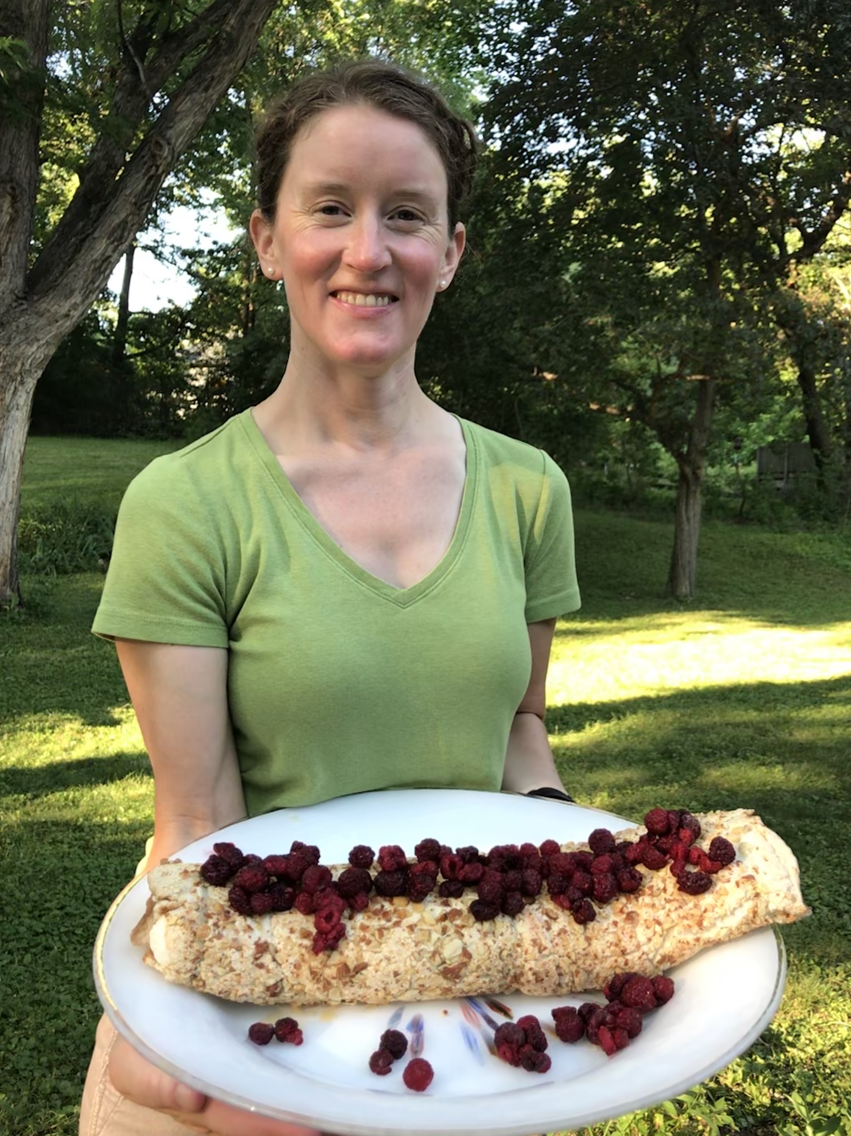 - Whisk the cream until it has stiff peaks. Gently fold in half the raspberries. Spread the cream evenly over the meringue. Using the parchment under the meringue as a help, roll the long side fairly tightly until the meringue is all rolled up. Wrap in parchment and chill before serving. Scatter with remaining raspberries over the top to serve.