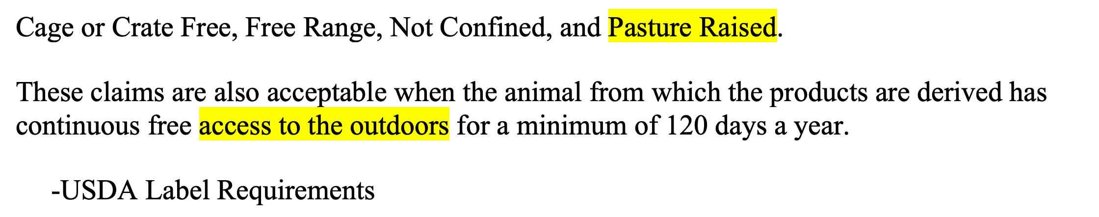 So to be clear, when you are buying any poultry products in the store, the term ‘pasture raised’ only means access to the outside. One should probably assume there is no green grass and that the birds are raised about the same as ‘cage free’ factory chickens.