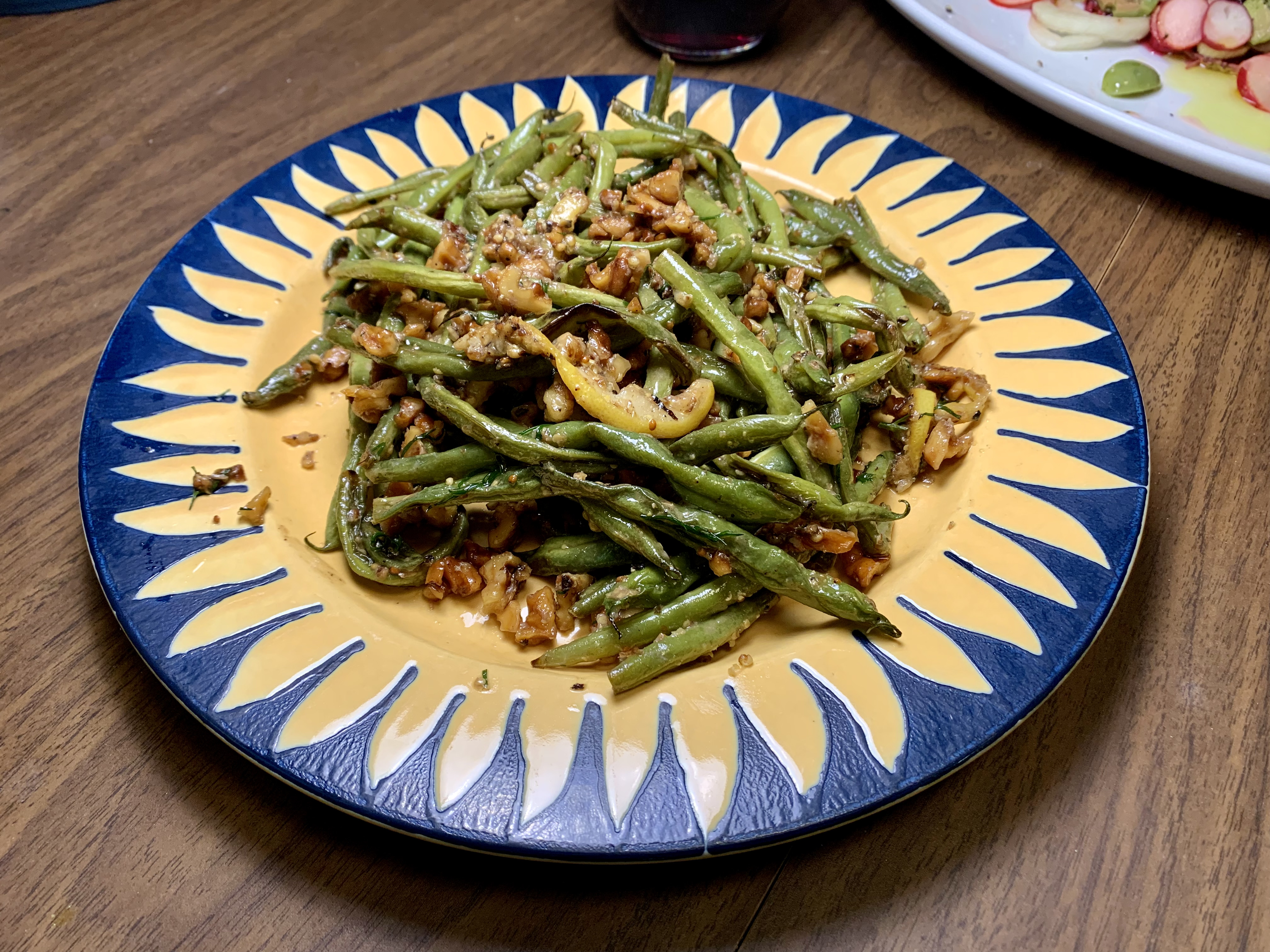 Roast green beans and lemon slices for 12-15 minutes on a rimmed baking sheet with 1-2 Tbsp of olive oil, salt and pepper. Toss beans once or twice. They should have started to char and brown in spots.