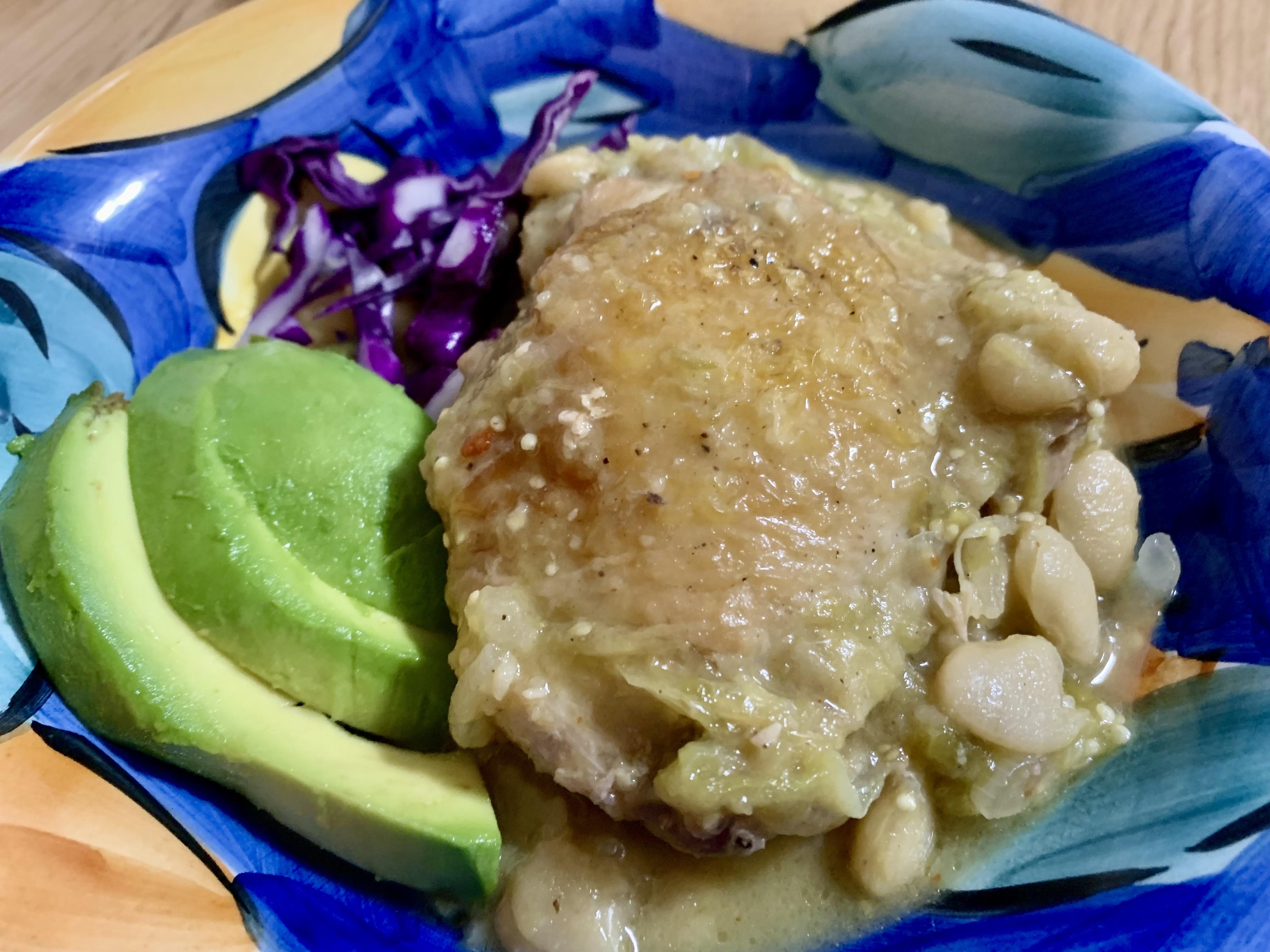 Reduce heat to medium and add chicken thighs back in and simmer, uncovered for 30 minutes or until tomatillos are tender and soupy.