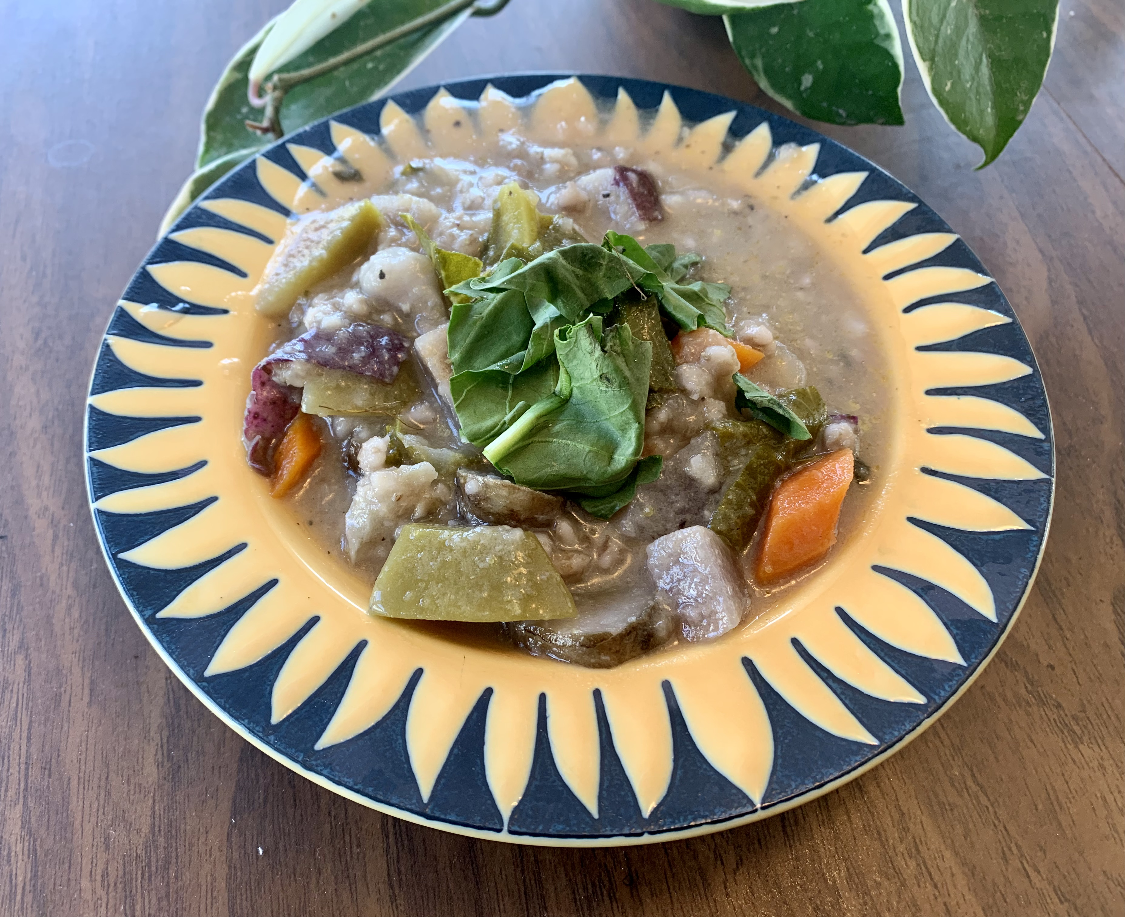 Add enough water to the pot to cover the veggies by 1/2 an inch, about to the first line of your pointer finger. Bring to a simmer, cover and cook until veggies are all tender, about 15-20 minutes. Add the kale and cook for another few minutes.