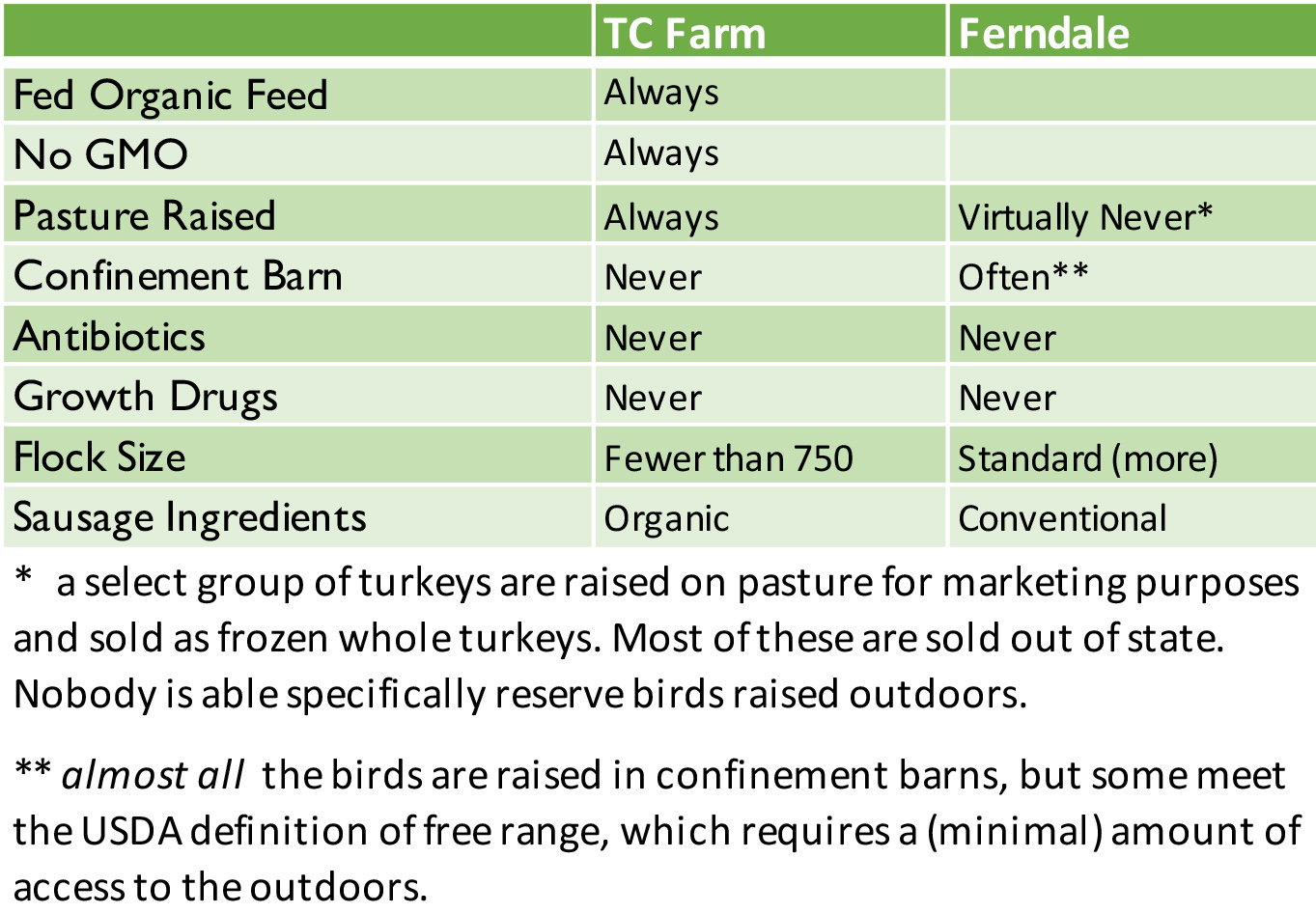 We strongly believe in is transparency in our food supply. We are including this chart that lays out the difference between TC Farm turkey and Ferndale turkey so you can see the difference and pick what is right for you.
