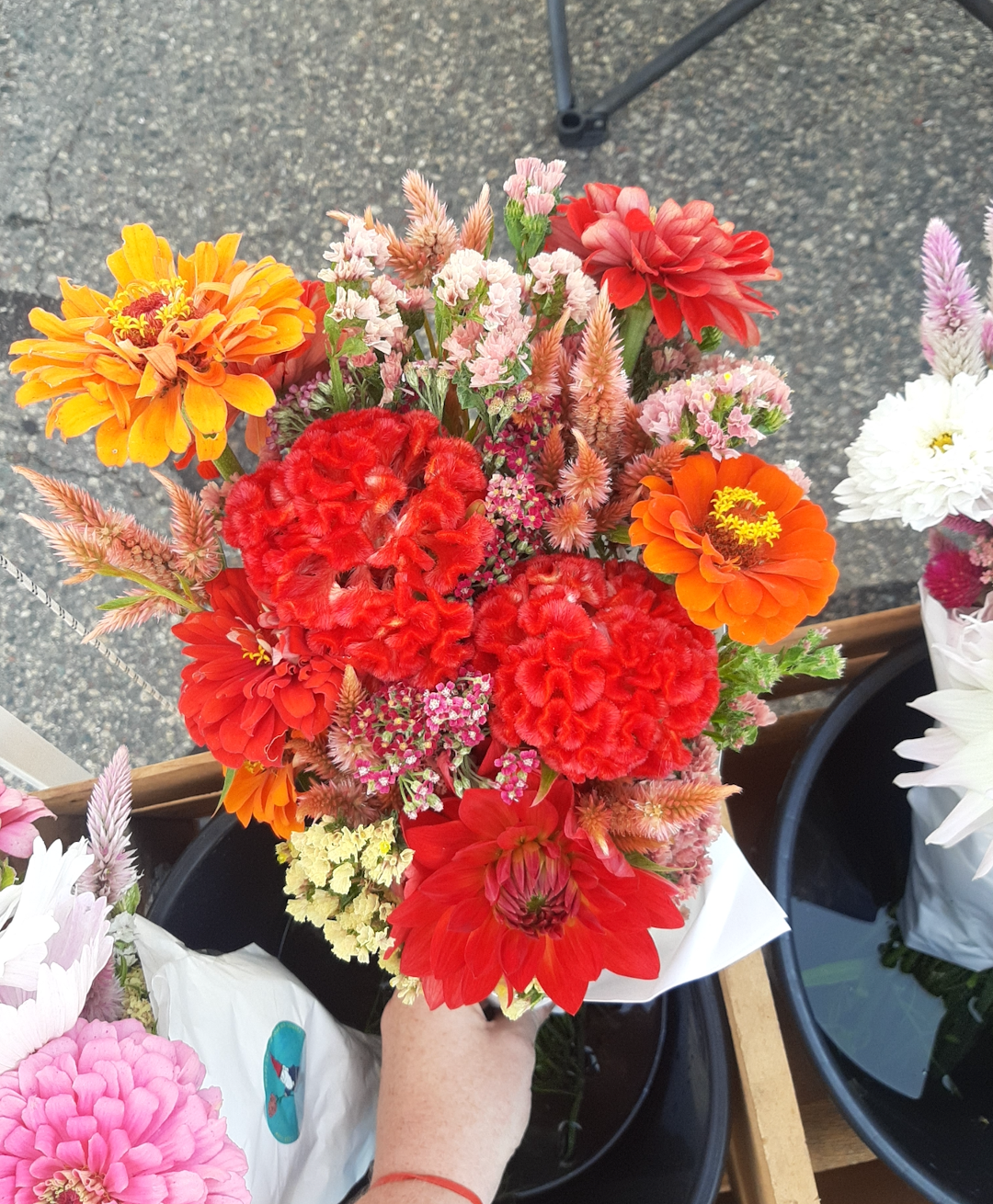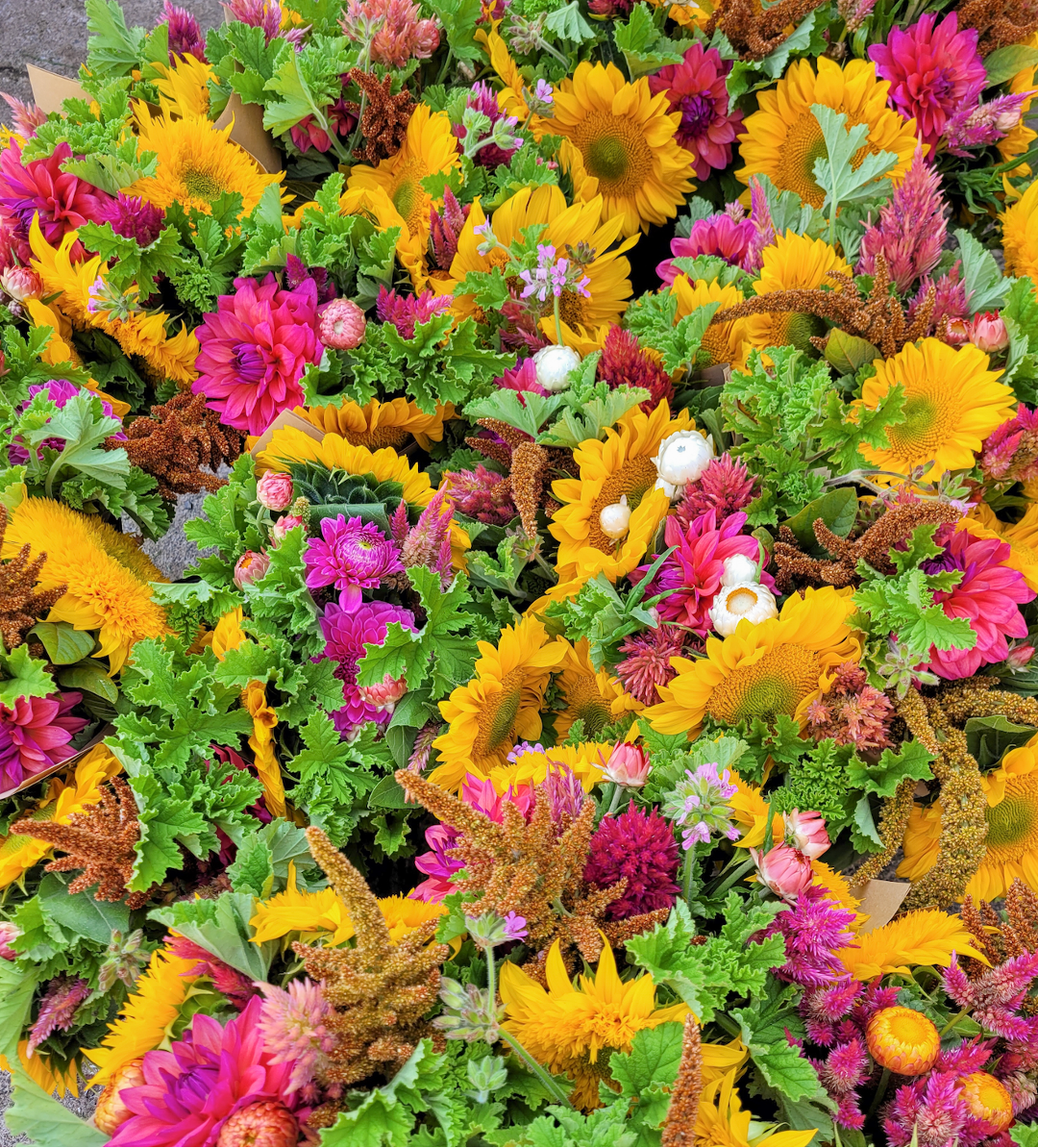 Flowers included will change as we move through the summer season into fall, but you can expect to see zinnias, cosmos, dahlias, carnations, sunflowers and more!