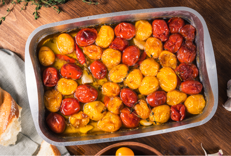 The flavor you get from roasting cherry tomatoes together with garlic and olive oil is worth turning your oven on, even in the summer! The olive oil combines with the flavor of the roasted garlic and juice from the tomatoes to create a strong, sweet & roasted tomato flavor.