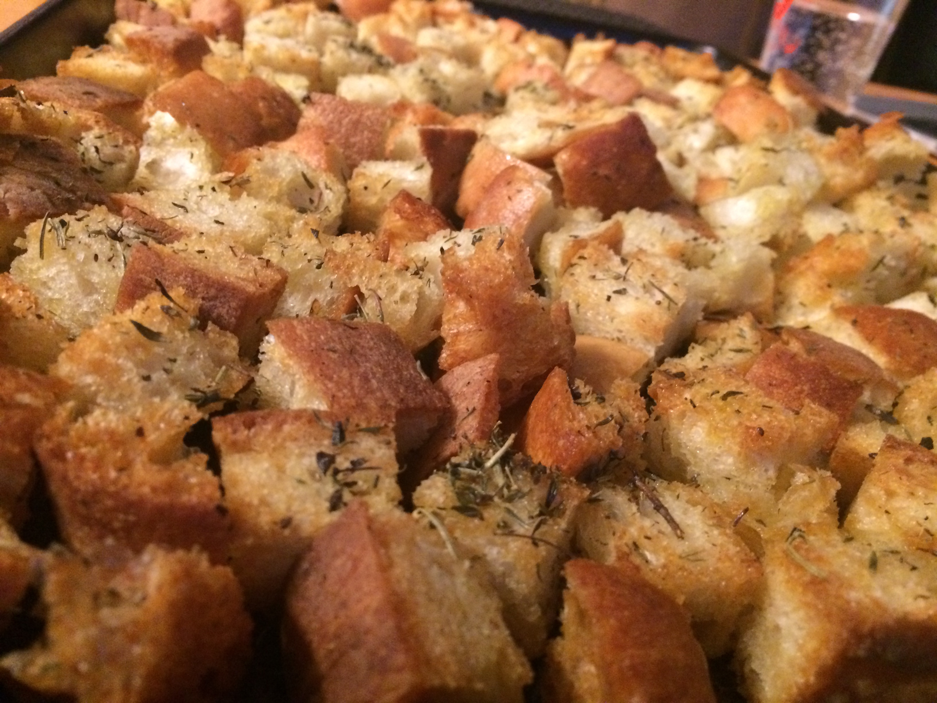 - Toast in a 250-350 degree oven until well dried -- not burnt, but golden... watch and stir as needed. Set aside, can be made days ahead OR you can buy seasoned bags of croutons instead.
