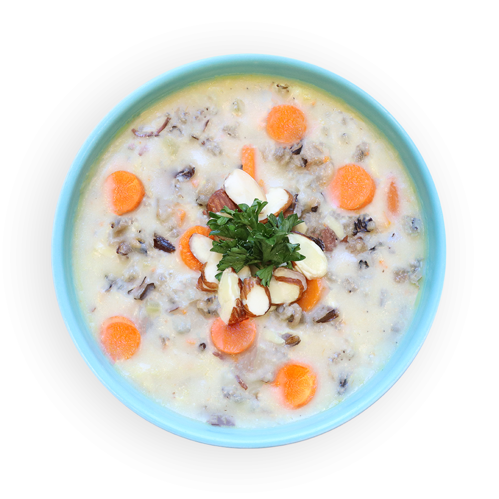 Ingredients: Vegetable Stock* (Water, Onions*, Celery*, Carrots*, Tomatoes*, Cold Pressed Sunflower Oil*, Garlic*, Parsley*, Thyme*, Black Pepper*, Cloves*), Heavy Whipping Cream*, Wild Rice, Onions*, Mushrooms*, Carrots*, Butter* (Pasteurized Sweet Cream*, Microbial Cultures), Rice Flour*, Celery*, Almonds, Sherry, Salt, Garlic*, Parsley*, Black Pepper*, Curry Powder* (Turmeric*, Paprika*, Fenugreek*, Coriander*, Black Pepper*, Cumin*, Ginger*, Celery Seed*, Cloves*, Caraway*, Cayenne*), Mustard Seed*, Thyme*, Bay Leaves*.
